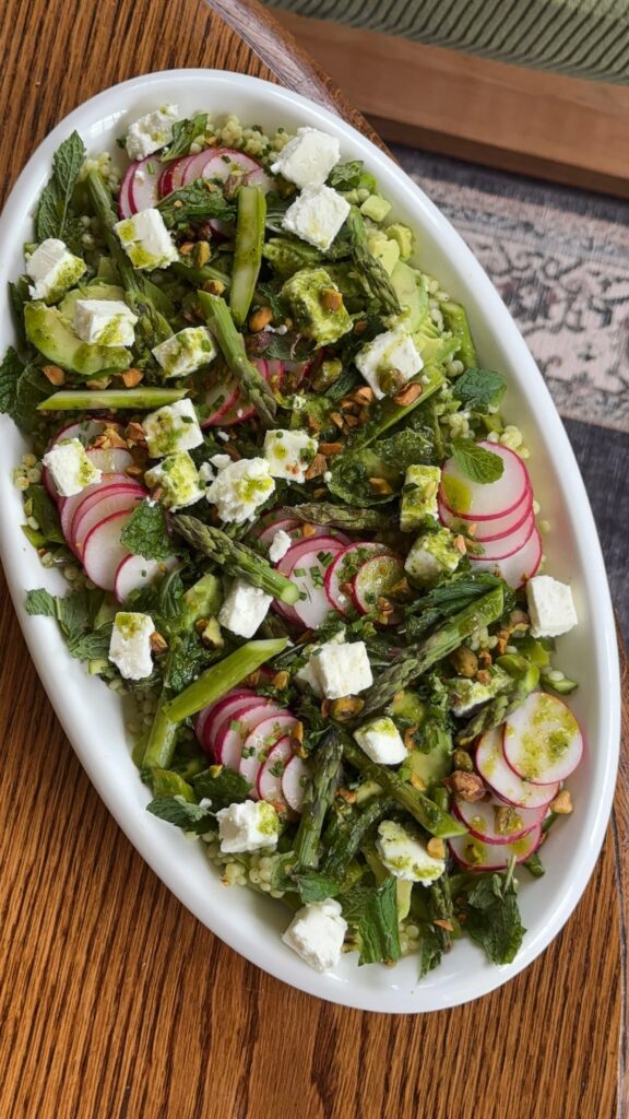 Leaving pea territory to tell you about this one. It’s substantial. It’s SPECIAL. Green goddess dressing, charred asparagus, sliced radishes, toasted pistachios, fresh herbs, and feta chunks on a bed of grains. A salad with main character energy.