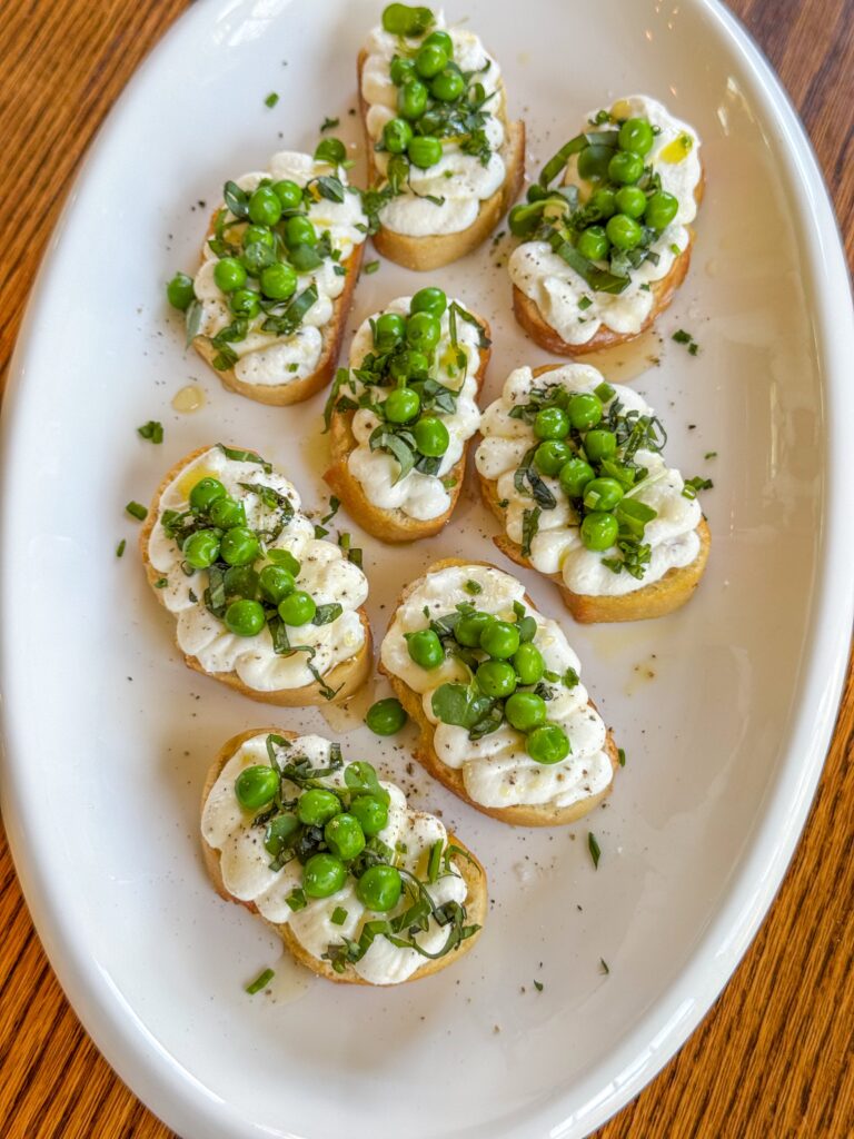 Clouds of whipped ricotta on golden toast, topped with sweet spring peas, fresh herbs, and a drizzle of good olive oil. Elegant, easy, and wildly pretty on a table.