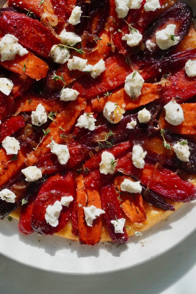 She’s perfect. Just look at her. A savory tart tatin built on honey butter-glazed rainbow carrots arranged into a stunning crown, flipped onto golden pastry and dotted with goat cheese. Pure art.