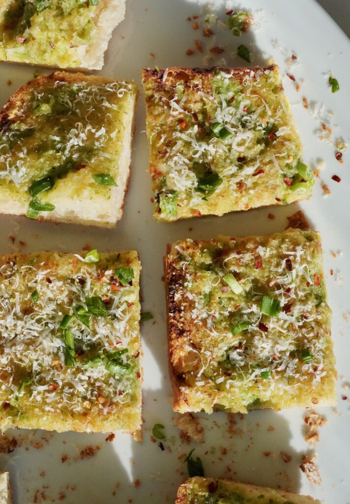 I repeat. SPRING ONION GARLIC BREAD. It’s garlicky, it’s cheesy, it’s loaded with scallions and chili flakes and grated parm. Serve it alongside literally anything and watch it disappear first.