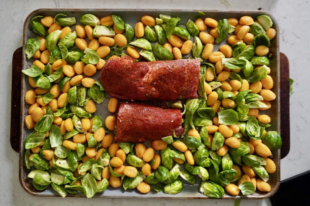 - Roast everything together for 18–20 minutes, checking on the gnocchi and sprouts once during cooking, and turning if needed, until the pork reaches an internal temperature of 140°F.