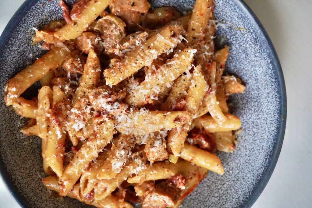 There’s something magical about a one-pot pasta dinner — everything comes together in one pan, the flavors marry beautifully, and clean-up is almost nonexistent (unless you have a toddler who throws food everywhere like I do, then it’s just another night lol.) One of my favorites is this sun dried tomato pasta with chicken sausage, which combines robust flavors with simple preparation.