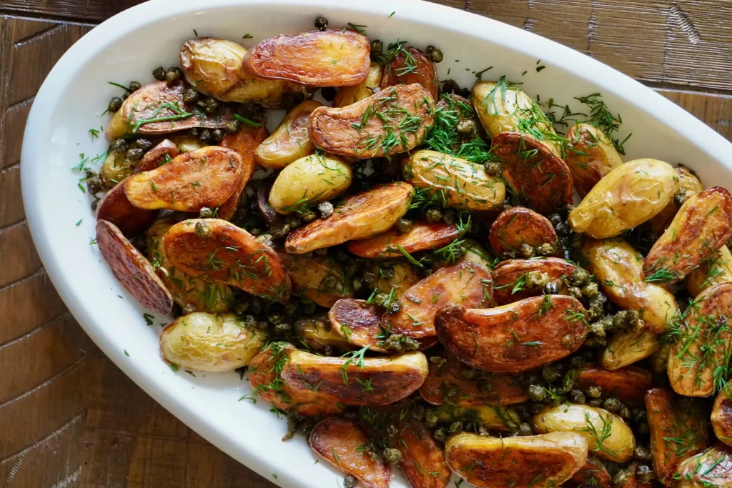Golden roasted potatoes topped with fried capers and fresh dill. Hearty enough for fall, but still bright and fresh.